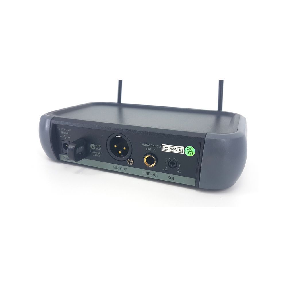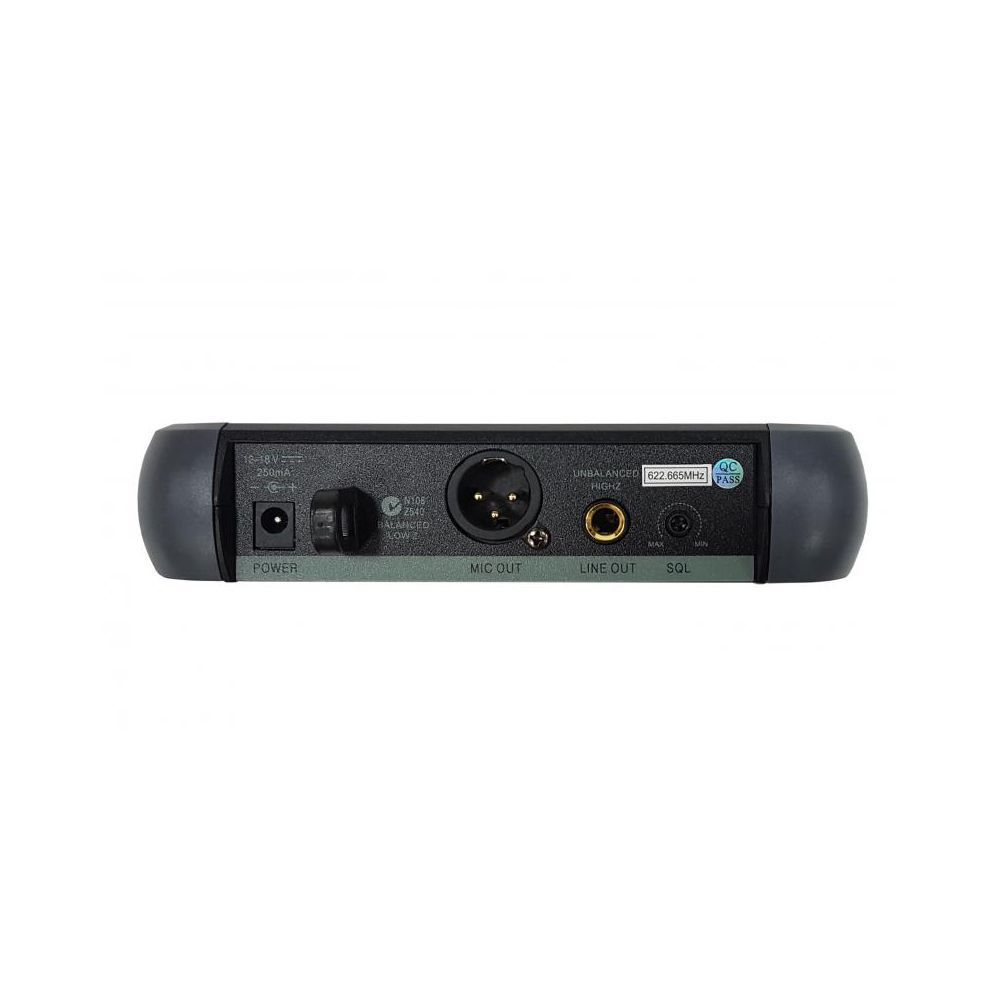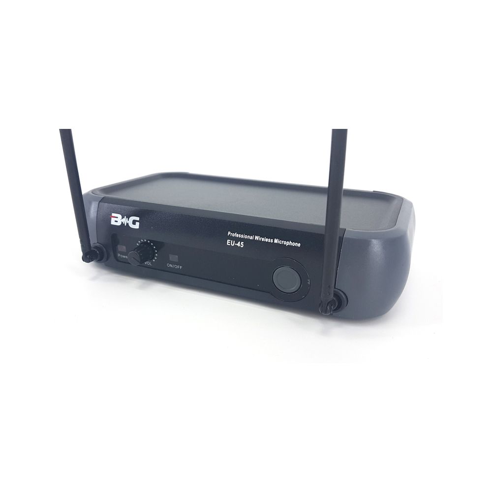 BG EU-45B представляет собой качественную вокальную радиосистему, которая работает в широком звуковом диапазоне. Модель можно использовать как на открытых площадках, так и на закрытых мероприятиях.   Комплектация: 1. Приемник 2. Ручной микрофон Приемник: – индикатор переключателя ON/OFF – регулятор громкости – RF-индикатор – переключатель ON/OFF – антенна приемника – разъем кабеля питания – балансный выходной разъем – выходной аудиоразъем – регулятор шумоподавителя Микрофон: – капсюль – индикатор низкого заряда – переключатель питания – отсек для элементов питания