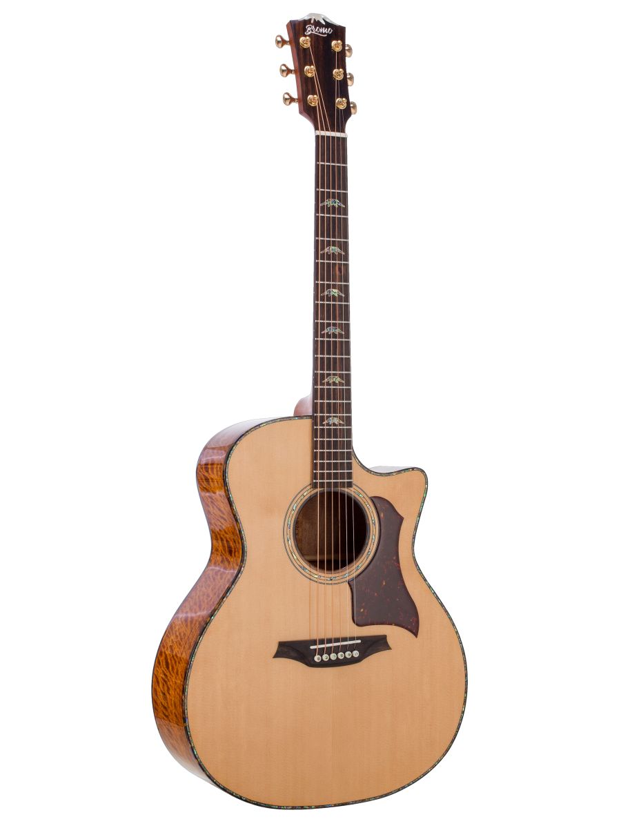 Bromo BAN2CE Гитара электроакустическая с вырезом Grand Auditorium, верхняя дека: цельная ель, нижняя дека и обечайка: огненный мовингу, гриф: махагони с двумя эбеновыми вставками, накладка грифа: макассарский эбен, двухсторонний анкер, колки: литье Mt. Bromo, позолоченные, электроника: Fishman “Sonitone”, лакированная, в чехле