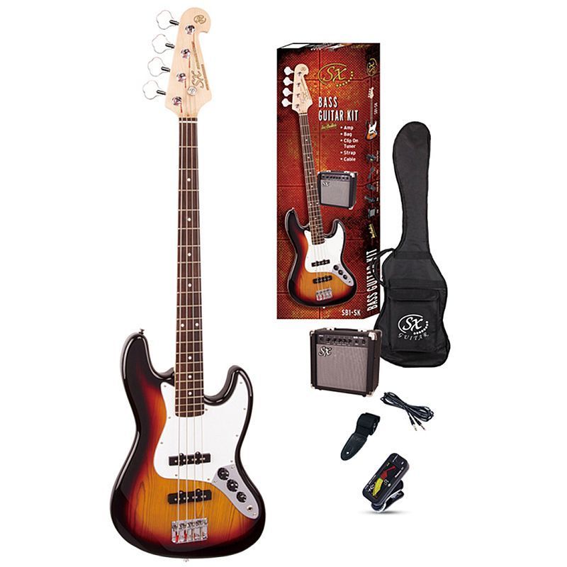 SX SB1-SK/3TS Набор: бас-гитара SB1-SK, корпус: липа, гриф: клен, накладака: палисандр, 21 лад, звукосниматели 2 Single Coil, регуляторы: 2 тон, 1 громкость; басовый комбоусилитель 15Вт, тюнер, кабель, чехол, ремень для гитары